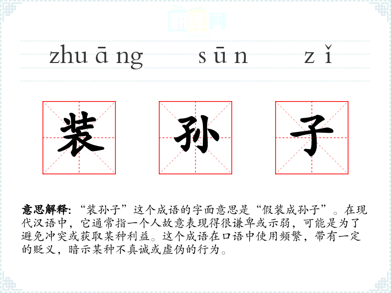 “装孙子”这个成语的字面意思是“假装成孙子”。在现代汉语中,它通常指一个人故意表现得很谦卑或示弱,可能是为了避免冲突或获取某种利益。这个成语在口语中使用频繁,带有一定的贬义,暗示某种不真诚或虚伪的行为。