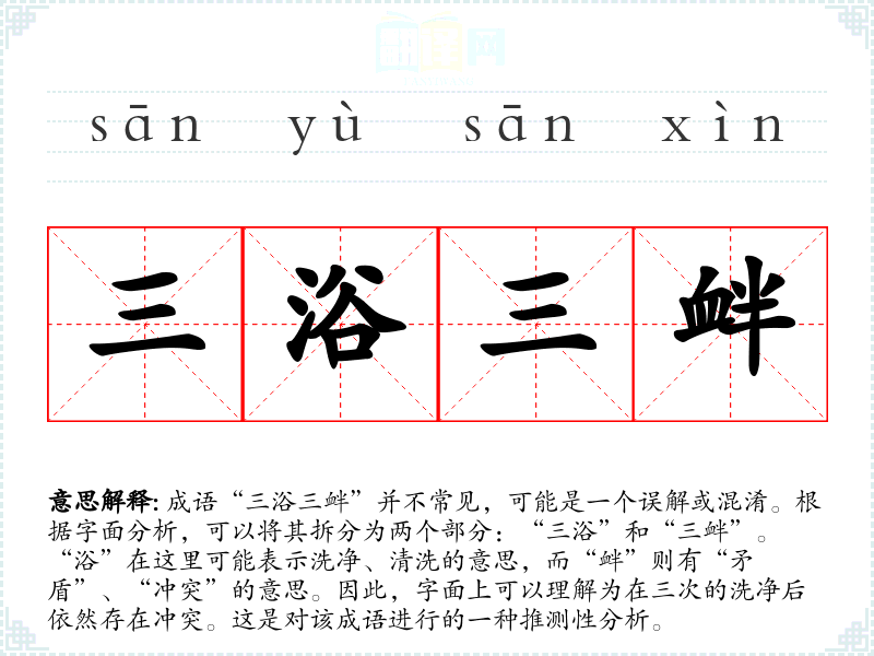 成语“三浴三衅”并不常见,可能是一个误解或混淆。根据字面分析,可以将其拆分为两个部分:“三浴”和“三衅”。“浴”在这里可能表示洗净、清洗的意思,而“衅”则有“矛盾”、“冲突”的意思。因此,字面上可以理解为在三次的洗净后依然存在冲突。这是对该成语进行的一种推测性分析。