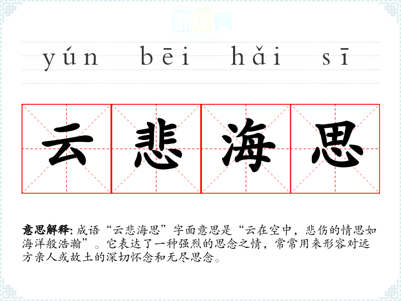 成语“云悲海思”字面意思是“云在空中,悲伤的情思如海洋般浩瀚”。它表达了一种强烈的思念之情,常常用来形容对远方亲人或故土的深切怀念和无尽思念。