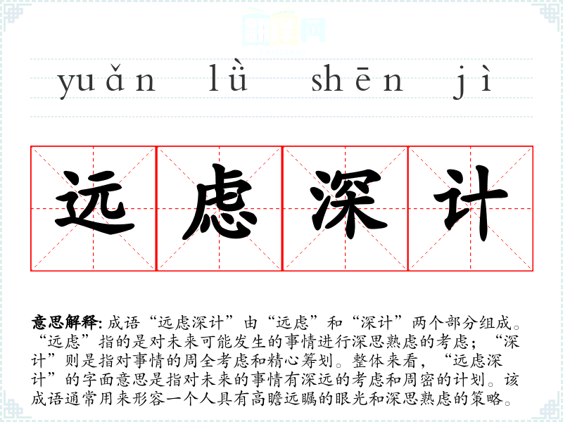 成语“远虑深计”由“远虑”和“深计”两个部分组成。“远虑”指的是对未来可能发生的事情进行深思熟虑的考虑;“深计”则是指对事情的周全考虑和精心筹划。整体来看,“远虑深计”的字面意思是指对未来的事情有深远的考虑和周密的计划。该成语通常用来形容一个人具有高瞻远瞩的眼光和深思熟虑的策略。