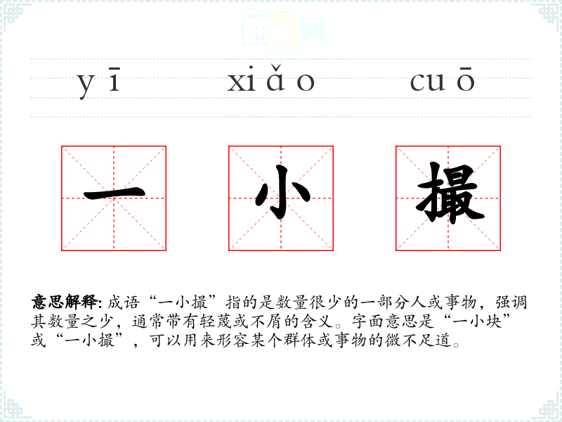 成语“一小撮”指的是数量很少的一部分人或事物,强调其数量之少,通常带有轻蔑或不屑的含义。字面意思是“一小块”或“一小撮”,可以用来形容某个群体或事物的微不足道。
