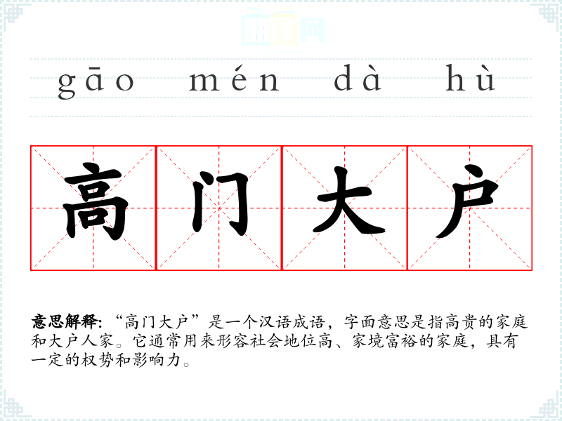 “高门大户”是一个汉语成语,字面意思是指高贵的家庭和大户人家。它通常用来形容社会地位高、家境富裕的家庭,具有一定的权势和影响力。