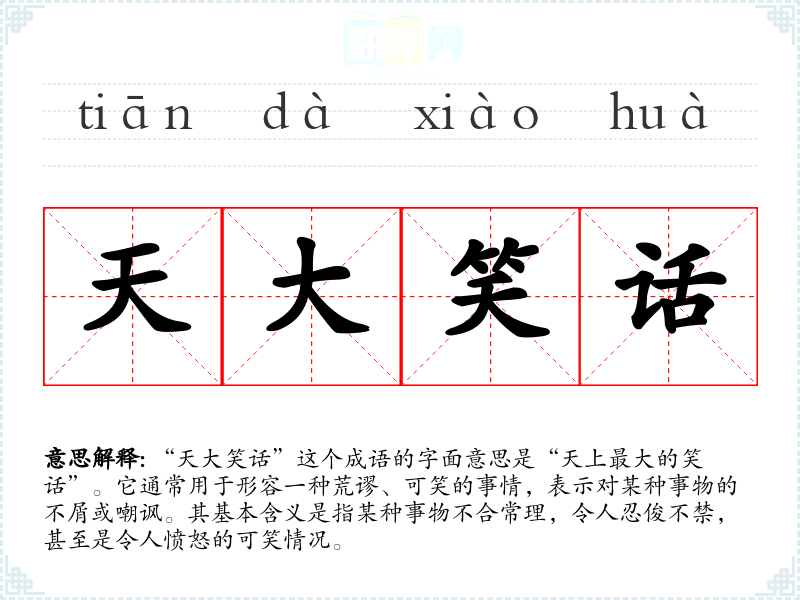 “天大笑话”这个成语的字面意思是“天上最大的笑话”。它通常用于形容一种荒谬、可笑的事情,表示对某种事物的不屑或嘲讽。其基本含义是指某种事物不合常理,令人忍俊不禁,甚至是令人愤怒的可笑情况。