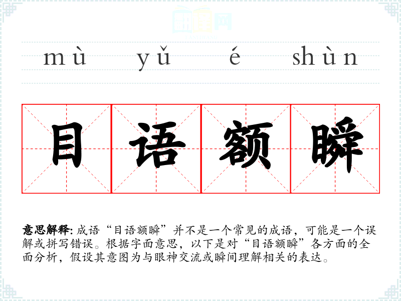 成语“目语额瞬”并不是一个常见的成语,可能是一个误解或拼写错误。根据字面意思,以下是对“目语额瞬”各方面的全面分析,假设其意图为与眼神交流或瞬间理解相关的表达。
