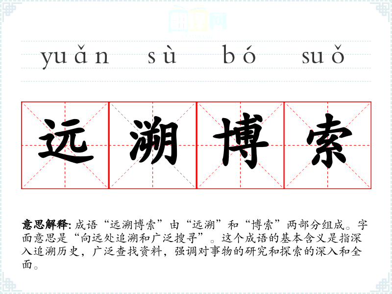 成语“远溯博索”由“远溯”和“博索”两部分组成。字面意思是“向远处追溯和广泛搜寻”。这个成语的基本含义是指深入追溯历史,广泛查找资料,强调对事物的研究和探索的深入和全面。