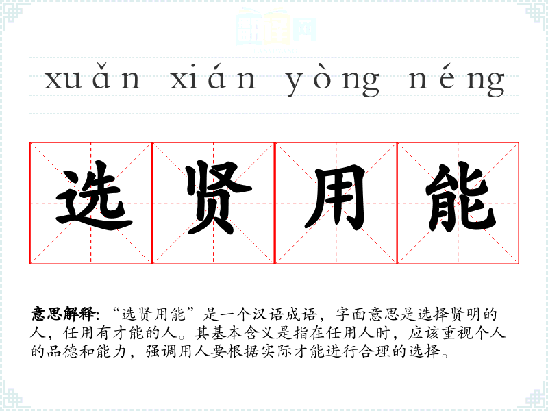 “选贤用能”是一个汉语成语,字面意思是选择贤明的人,任用有才能的人。其基本含义是指在任用人时,应该重视个人的品德和能力,强调用人要根据实际才能进行合理的选择。