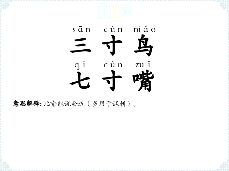 | 三寸鸟,七寸嘴 | 比喻能说会道(多用于讽刺)。 |