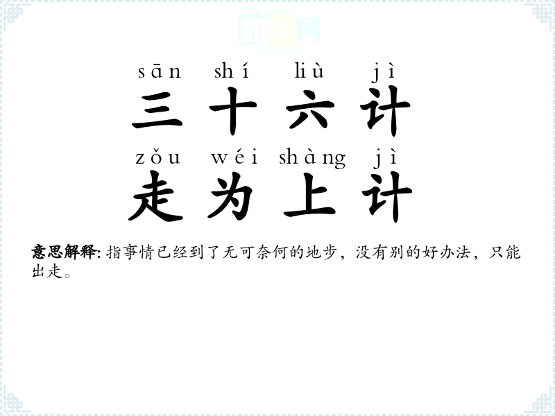 原指无力抵抗敌人,以逃走为上策。后指事情已经到了无可奈何的地步,没有别的好办法,只能出走。 |