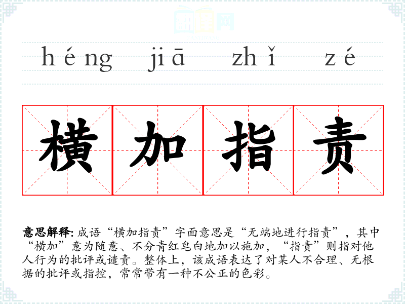 “横加指责”并没有明确的历史典故或文学出处,但其字面构成可以追溯到古代文学与哲学的论述中,尤其是对言辞和行为的评价。成语中“横”字的使用,强调了不分青红皂白、随意施加的特点,反映了一种社会对公正和客观评价的追求。