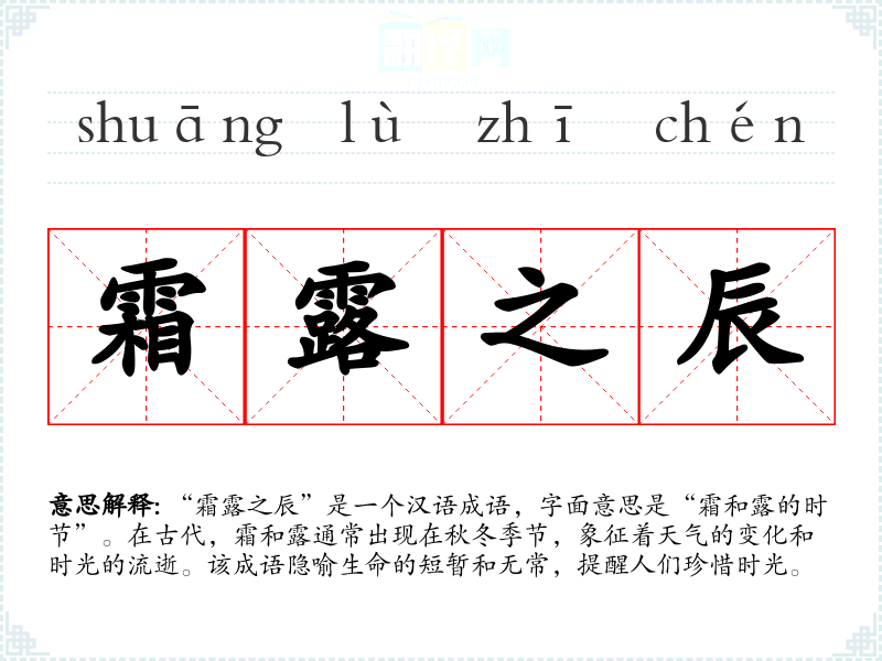 在英语中,类似的表达可以是“time flies”,虽然没有直接对应“霜露之辰”的意象,但同样强调时间的流逝。在其他文化中,也有表达时间短暂的成语或谚语,反映出人类对时间的共同认知和感叹。