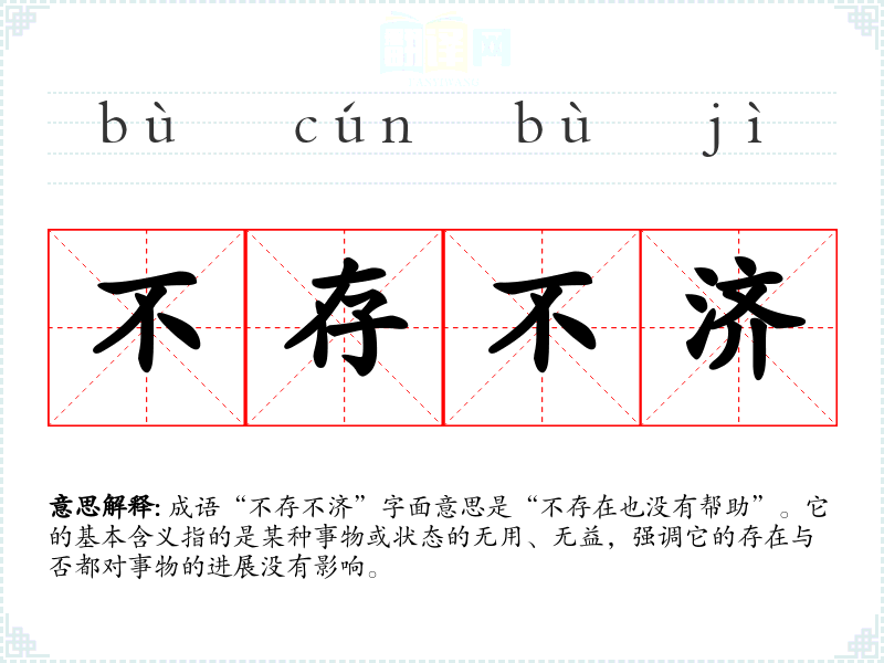 成语“不存不济”字面意思是“不存在也没有帮助”。它的基本含义指的是某种事物或状态的无用、无益,强调它的存在与否都对事物的进展没有影响。