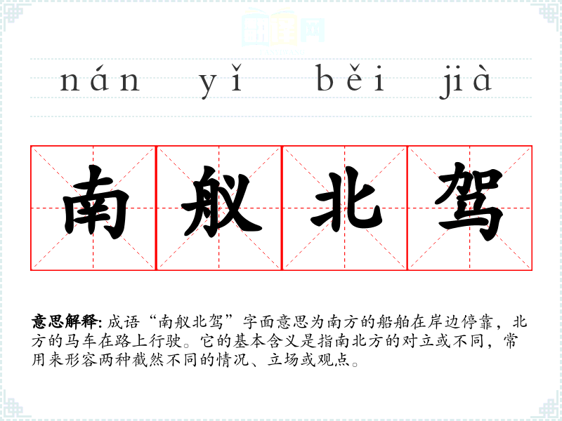 成语“南舣北驾”字面意思为南方的船舶在岸边停靠,北方的马车在路上行驶。它的基本含义是指南北方的对立或不同,常用来形容两种截然不同的情况、立场或观点。
