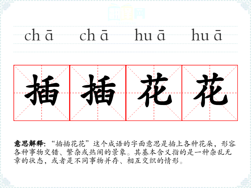 “插插花花”这个成语的字面意思是插上各种花朵,形容各种事物交错、繁杂或热闹的景象。其基本含义指的是一种杂乱无章的状态,或者是不同事物并存、相互交织的情形。