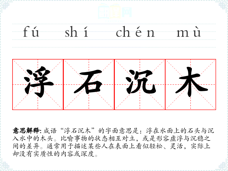 “浮石沉木”这个成语并没有明确的历史典故,但其意象可以在古代文献中找到。在古代的哲学和文学中,常常用“浮”和“沉”来比喻人的品德、学识与外在表现的不同。类似的表达在道教和儒家思想中都有出现,强调表象与内涵、轻浮与稳重的对比。