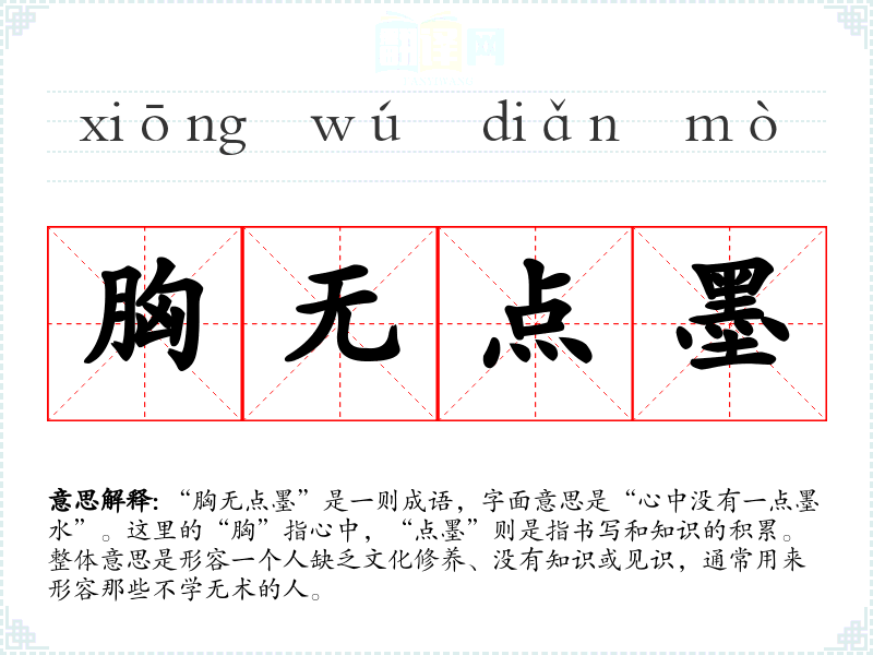 “胸无点墨”是一则成语,字面意思是“心中没有一点墨水”。这里的“胸”指心中,“点墨”则是指书写和知识的积累。整体意思是形容一个人缺乏文化修养、没有知识或见识,通常用来形容那些****的人。