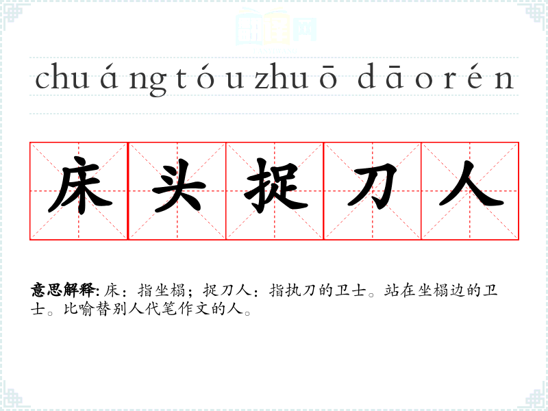 | 床头捉刀人 | 床:指坐榻;捉刀人:指执刀的卫士。站在坐榻边的卫士。比喻替别人代笔作文的人。 |
