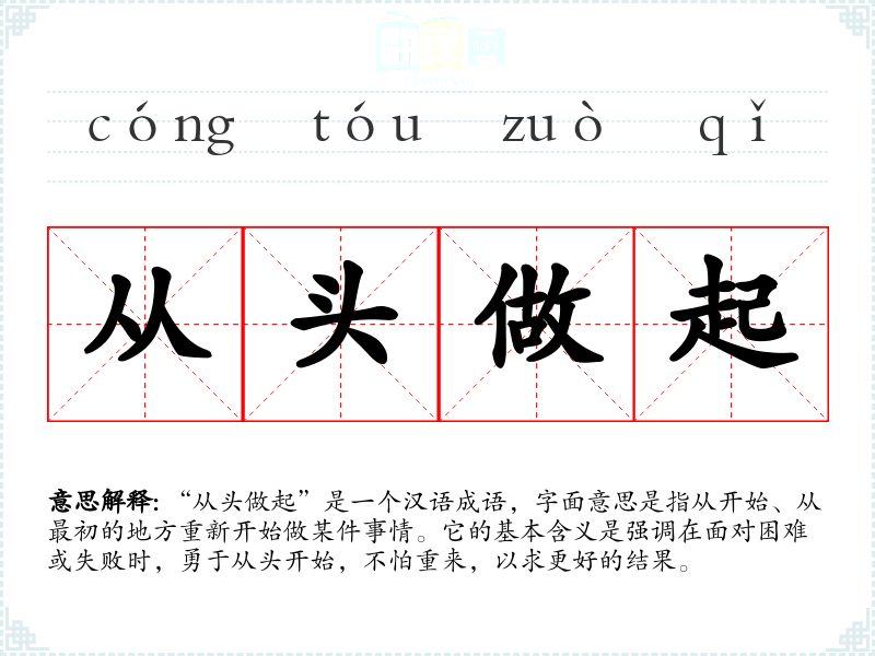 “从头做起”是一个汉语成语,字面意思是指从开始、从最初的地方重新开始做某件事情。它的基本含义是强调在面对困难或失败时,勇于从头开始,不怕重来,以求更好的结果。