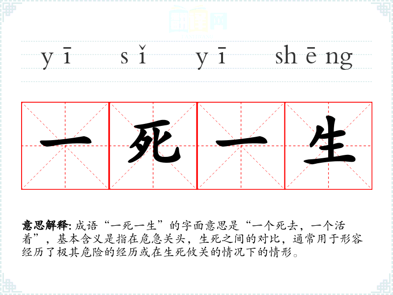 成语“一死一生”的字面意思是“一个死去,一个活着”,基本含义是指在危急关头,生死之间的对比,通常用于形容经历了极其危险的经历或在生死攸关的情况下的情形。