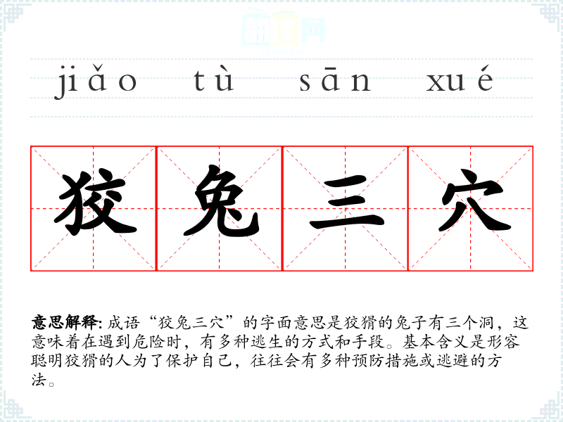 成语“狡兔三穴”的字面意思是狡猾的兔子有三个洞,这意味着在遇到危险时,有多种逃生的方式和手段。基本含义是形容聪明狡猾的人为了保护自己,往往会有多种预防措施或逃避的方法。