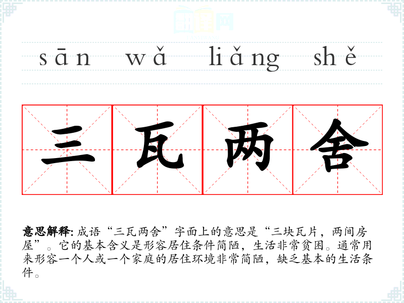 - 反义成语:富丽堂皇, 衣食无忧。这些成语描绘的是富裕、舒适的生活状态,与“三瓦两舍”形成鲜明对比。