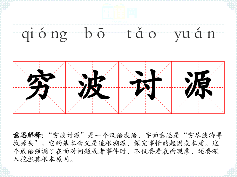 “穷波讨源”是一个汉语成语,字面意思是“穷尽波涛寻找源头”。它的基本含义是追根溯源,探究事情的起因或本质。这个成语强调了在面对问题或者**时,不仅要看表面现象,还要深入挖掘其根本原因。
