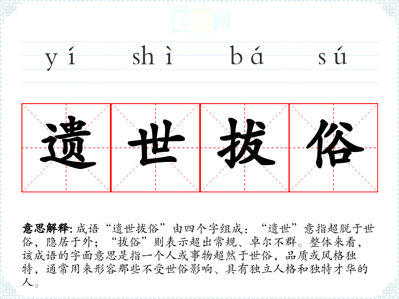 成语“遗世拔俗”由四个字组成:“遗世”意指超脱于世俗,隐居于外;“拔俗”则表示超出常规、卓尔不群。整体来看,该成语的字面意思是指一个人或事物超然于世俗,品质或风格独特,通常用来形容那些不受世俗影响、具有独立人格和独特才华的人。