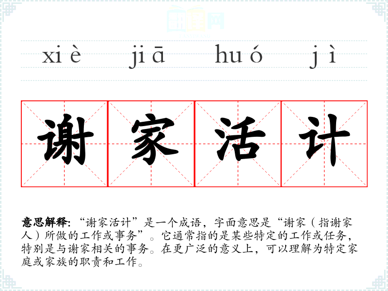 - 文学作品:在描写历史人物或家庭背景时,可以提到“谢家活计”来强调家族的责任和文化传承。