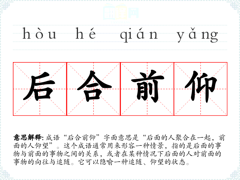 成语“后合前仰”字面意思是“后面的人聚合在一起,前面的人仰望”。这个成语通常用来形容一种情景,指的是后面的事物与前面的事物之间的关系,或者在某种情况下后面的人对前面的事物的向往与追随。它可以隐喻一种追随、仰望的状态。