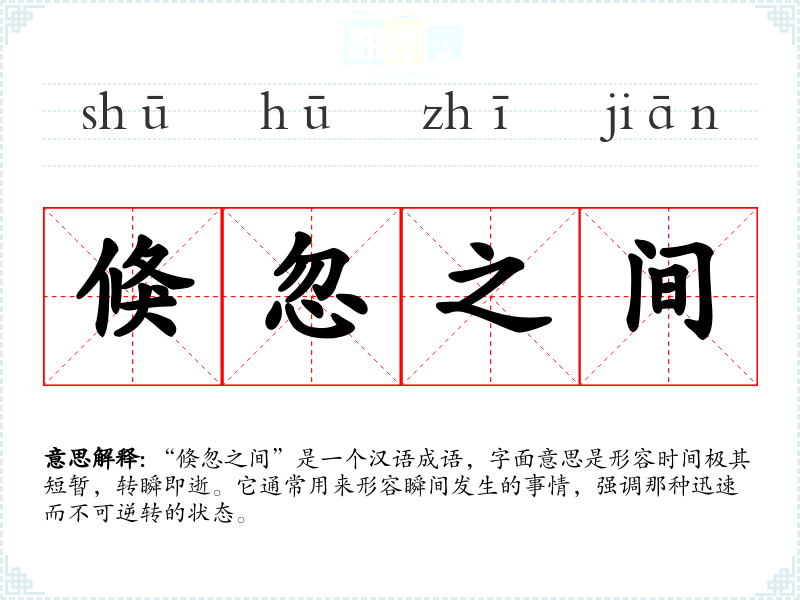- 反义成语:历久弥新、长久不衰。这些成语强调时间的延续性和持久性,与“倏忽之间”的瞬间感形成对比。