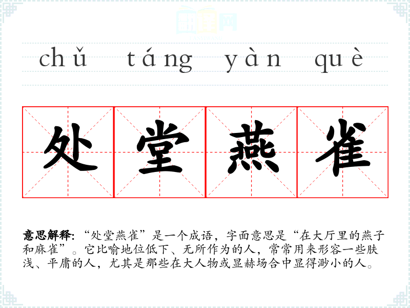 “处堂燕雀”是一个成语,字面意思是“在大厅里的燕子和麻雀”。它比喻地位低下、无所作为的人,常常用来形容一些肤浅、平庸的人,尤其是那些在大人物或显赫场合中显得渺小的人。