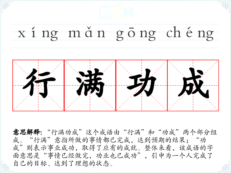 “行满功成”这个成语由“行满”和“功成”两个部分组成。“行满”意指所做的事情都已完成,达到预期的结果;“功成”则表示事业成功,取得了应有的成就。整体来看,该成语的字面意思是“事情已经做完,功业也已成功”,引申为一个人完成了自己的目标、达到了理想的状态。