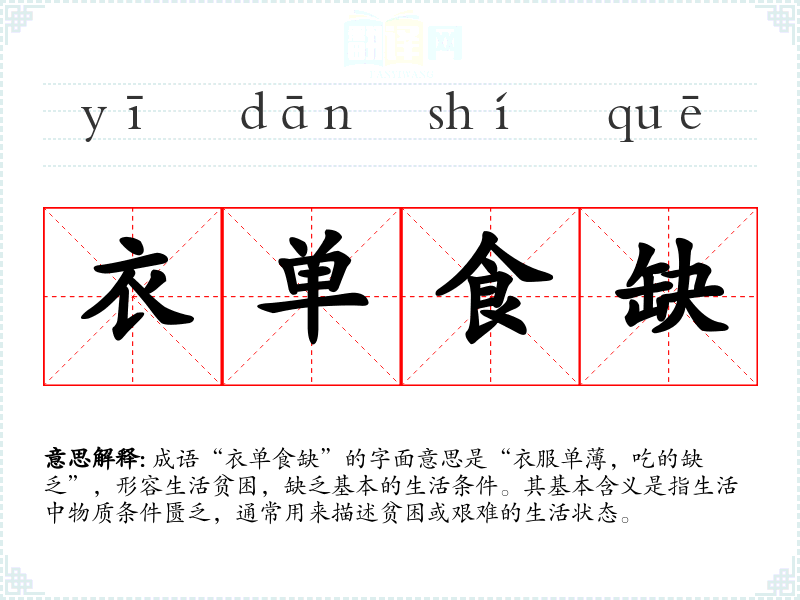 成语“衣单食缺”的字面意思是“衣服单*,吃的缺乏”,形容生活贫困,缺乏基本的生活条件。其基本含义是指生活中物质条件匮乏,通常用来描述贫困或艰难的生活状态。