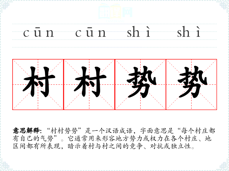 “村村势势”是一个汉语成语,字面意思是“每个村庄都有自己的气势”。它通常用来形容地方势力或权力在各个村庄、地区间都有所表现,暗示着村与村之间的竞争、对抗或独立性。