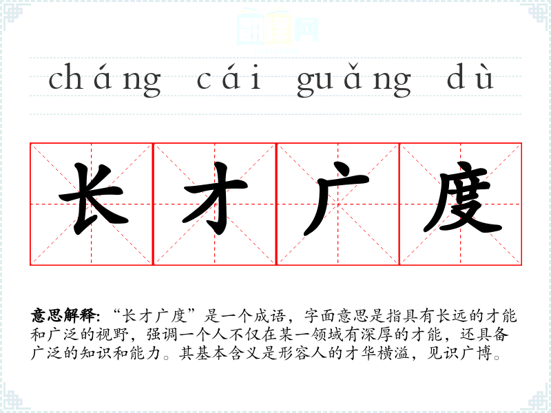 “长才广度”是一个成语,字面意思是指具有长远的才能和广泛的视野,强调一个人不仅在某一领域有深厚的才能,还具备广泛的知识和能力。其基本含义是形容人的才华横溢,见识广博。