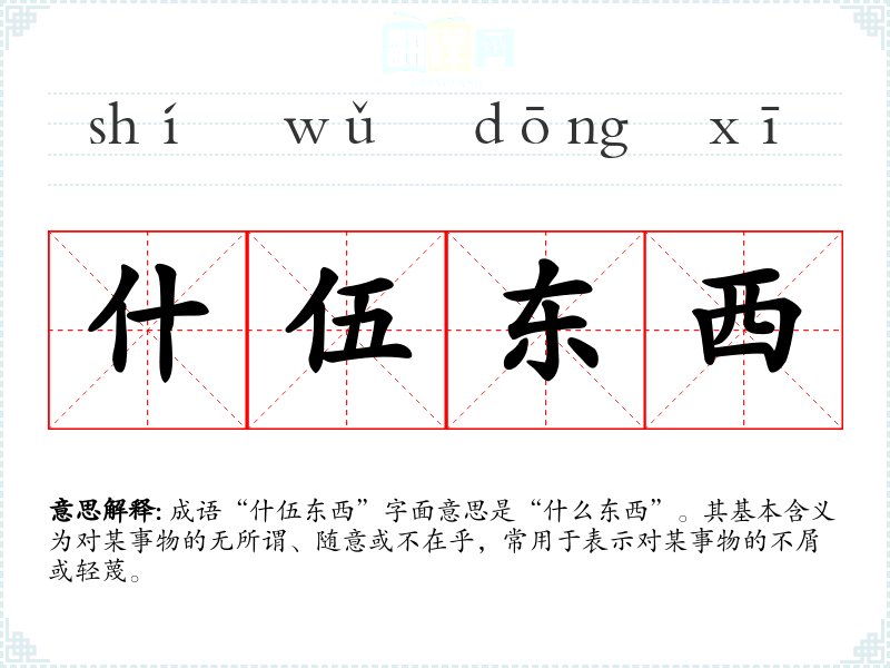 成语“什伍东西”字面意思是“什么东西”。其基本含义为对某事物的无所谓、随意或不在乎,常用于表示对某事物的不屑或轻蔑。