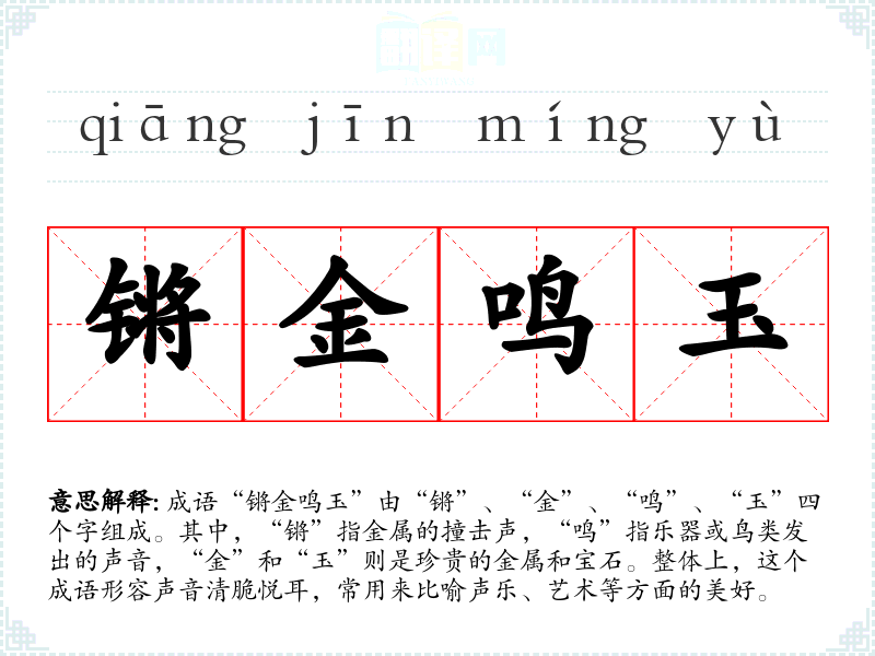 成语“锵金鸣玉”由“锵”、“金”、“鸣”、“玉”四个字组成。其中,“锵”指金属的撞击声,“鸣”指乐器或鸟类发出的声音,“金”和“玉”则是珍贵的金属和宝石。整体上,这个成语形容声音清脆悦耳,常用来比喻声乐、艺术等方面的美好。