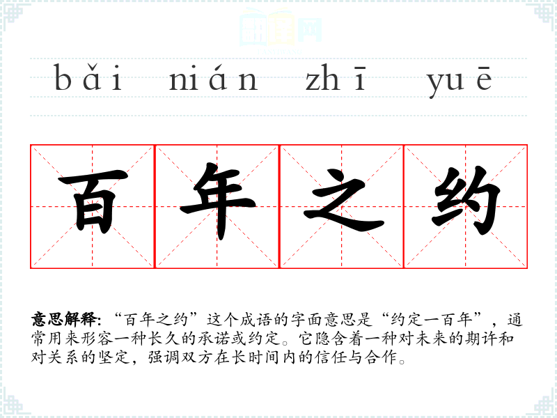 “百年之约”这个成语的字面意思是“约定一百年”,通常用来形容一种长久的承诺或约定。它隐含着一种对未来的期许和对关系的坚定,强调双方在长时间内的信任与合作。