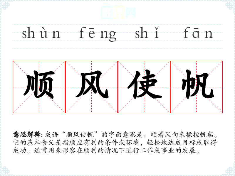 成语“顺风使帆”的字面意思是:顺着风向来操控帆船。它的基本含义是指顺应有利的条件或环境,轻松地达成目标或取得成功。通常用来形容在顺利的情况下进行工作或事业的发展。