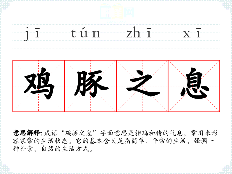 成语“鸡豚之息”字面意思是指鸡和猪的气息,常用来形容家常的生活状态。它的基本含义是指简单、平常的生活,强调一种朴素、自然的生活方式。