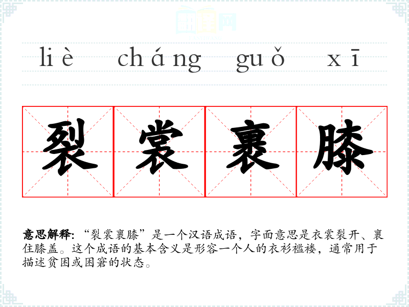 “裂裳裹膝”是一个汉语成语,字面意思是衣裳裂开、裹住膝盖。这个成语的基本含义是形容一个人的衣衫褴褛,通常用于描述贫困或困窘的状态。