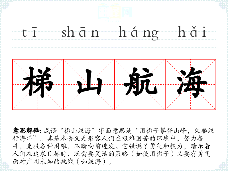 “梯山航海”并没有明确的历史典故或文学出处,但其构成的字面意义反映了**传统文化中对奋斗精神的认可。成语中的“梯”和“航海”分别象征着攀登和探索,描绘了人们在生活中不断追求更高目标的过程。