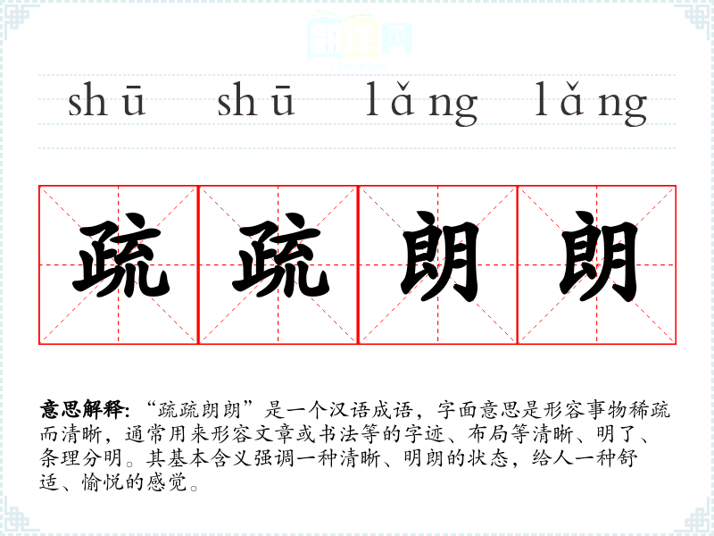 “疏疏朗朗”是一个汉语成语,字面意思是形容事物稀疏而清晰,通常用来形容文章或书法等的字迹、布局等清晰、明了、条理分明。其基本含义强调一种清晰、明朗的状态,给人一种舒适、愉悦的感觉。