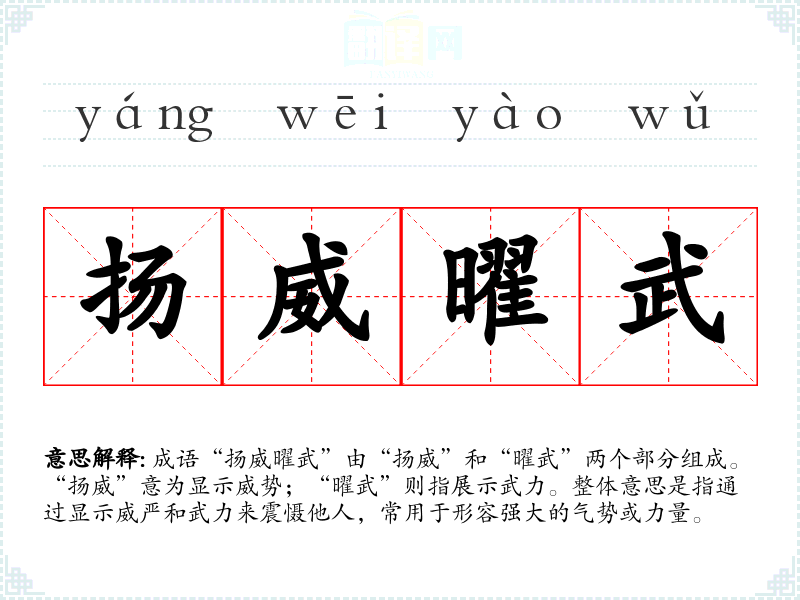 成语“扬威曜武”由“扬威”和“曜武”两个部分组成。“扬威”意为显示威势;“曜武”则指展示武力。整体意思是指通过显示威严和武力来震慑他人,常用于形容强大的气势或力量。