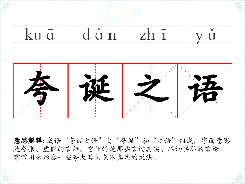 成语“夸诞之语”由“夸诞”和“之语”组成。字面意思是夸张、虚假的言辞。它指的是那些言过其实、不切实际的言论,常常用来形容一些夸大其词或不真实的说法。