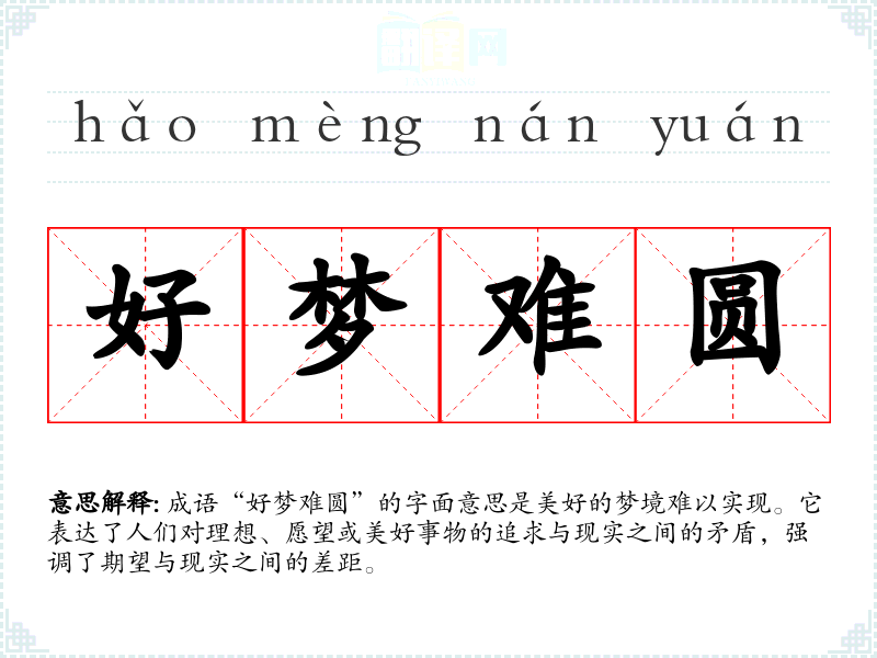 成语“好梦难圆”的字面意思是美好的梦境难以实现。它表达了人们对理想、愿望或美好事物的追求与现实之间的矛盾,强调了期望与现实之间的差距。