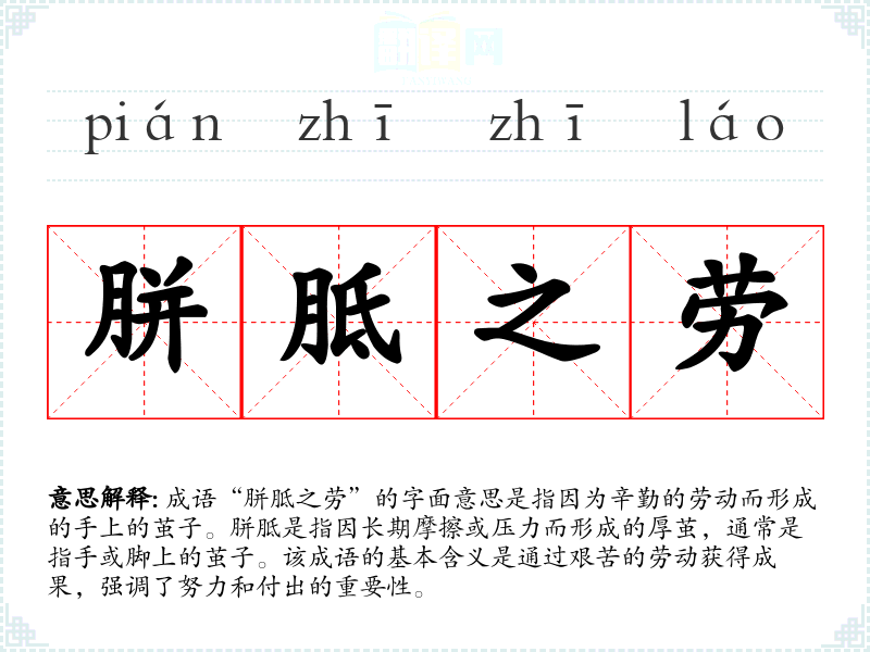 成语“胼胝之劳”的字面意思是指因为辛勤的劳动而形成的手上的茧子。胼胝是指因长期摩擦或压力而形成的厚茧,通常是指手或脚上的茧子。该成语的基本含义是通过艰苦的劳动获得成果,强调了努力和付出的重要性。
