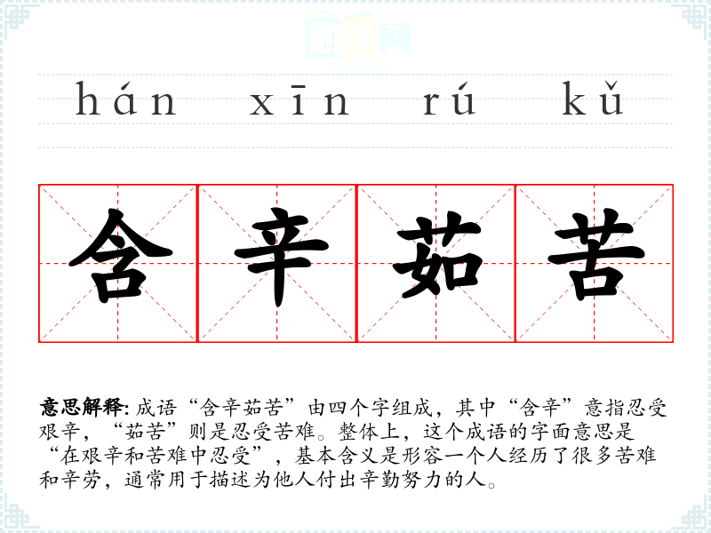 成语“含辛茹苦”由四个字组成,其中“含辛”意指忍受艰辛,“茹苦”则是忍受苦难。整体上,这个成语的字面意思是“在艰辛和苦难中忍受”,基本含义是形容一个人经历了很多苦难和辛劳,通常用于描述为他人付出辛勤努力的人。