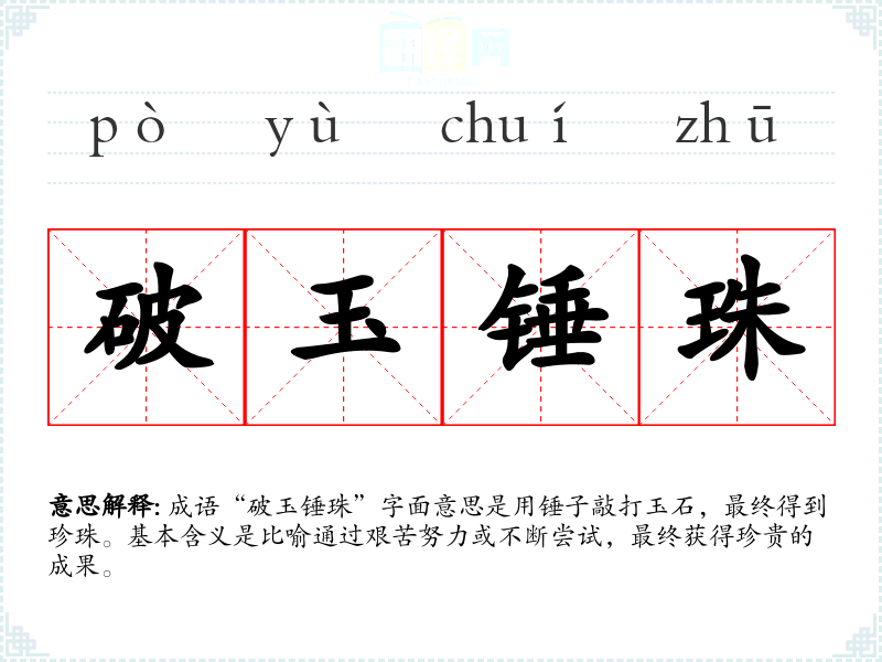 成语“破玉锤珠”字面意思是用锤子敲打玉石,最终得到珍珠。基本含义是比喻通过艰苦努力或不断尝试,最终获得珍贵的成果。
