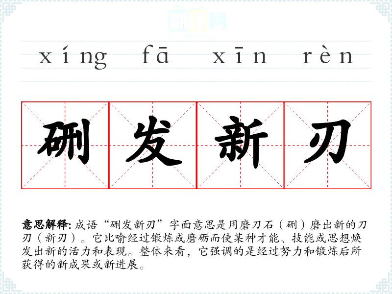 成语“硎发新刃”字面意思是用磨刀石(硎)磨出新的刀刃(新刃)。它比喻经过锻炼或磨砺而使某种才能、技能或思想焕发出新的活力和表现。整体来看,它强调的是经过努力和锻炼后所获得的新成果或新进展。
