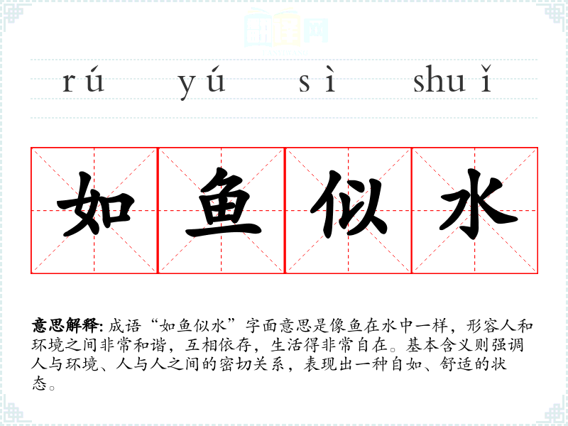 成语“如鱼似水”字面意思是像鱼在水中一样,形容人和环境之间非常和谐,互相依存,生活得非常自在。基本含义则强调人与环境、人与人之间的密切关系,表现出一种自如、舒适的状态。